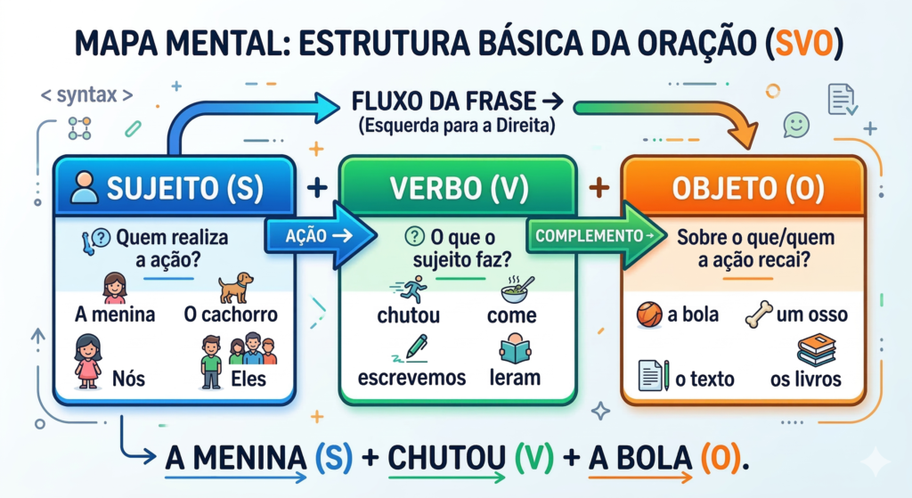 A estrutura fundamental da frase em inglês é chamada de SVO: Subject + Verb + Object (Sujeito + Verbo + Objeto).