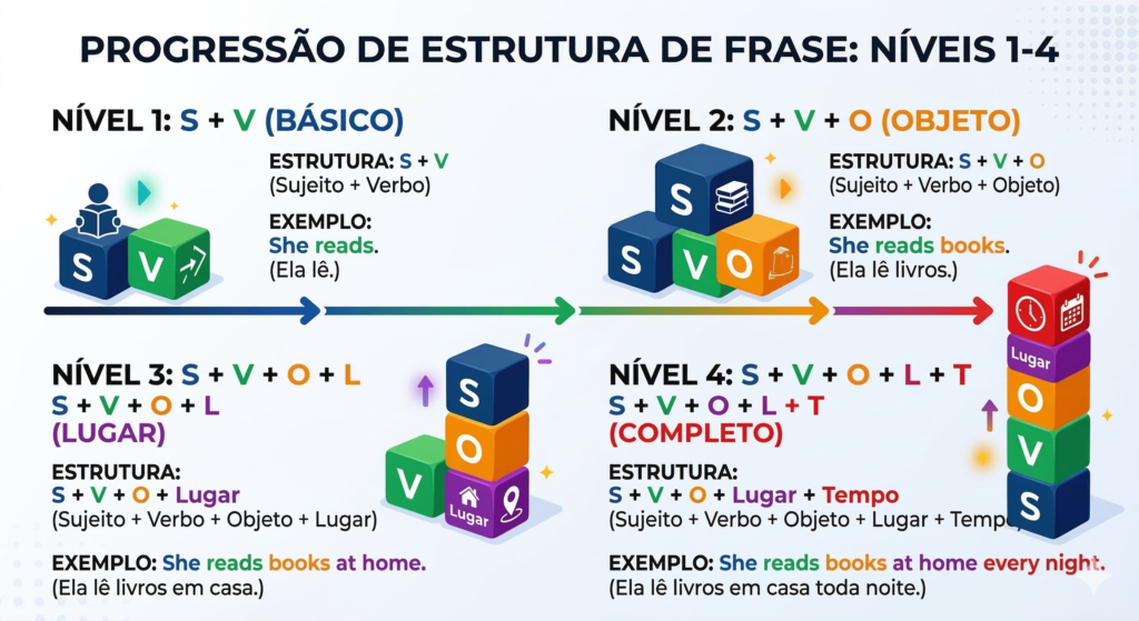 Agora observem: se invertermos She reads books para Books reads she, um falante nativo não vai entender como uma frase — vai soar como ruído. A posição de cada palavra é o que diz ao ouvinte: “esta palavra é o sujeito”, “esta é a ação”, “este é o objeto”.